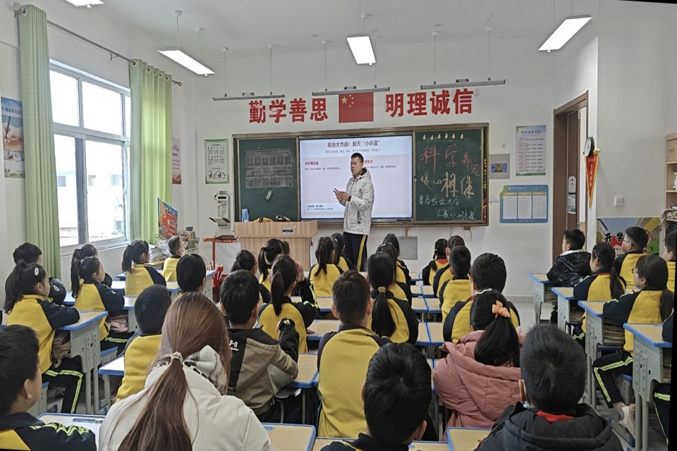 25级动科2501团支部与动科2502团支部走进平度市南村小学,开展趣味科普课堂。学生们化身“科普老师”,用生动的动画、实物模型和互动游戏,向小学生讲解宠物习性、科学养护常识及人与动物和谐相处的重要性,引导孩子们树立尊重生命、科学对待小动物的意识,现场气氛热烈,孩子们参与积极性高涨。