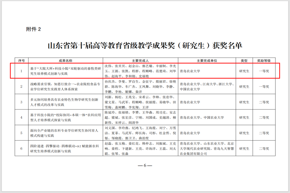 近日,山东省教育厅公布了第十届高等教育省级教学成果奖获奖名单,由aa3044永利集团院长沈伟教授作为第一完成人的教学成果《基于“大院大所+科技小院”双轮驱动的畜牧类研究生培养模式创新与实践》荣获研究生类教学成果一等奖。