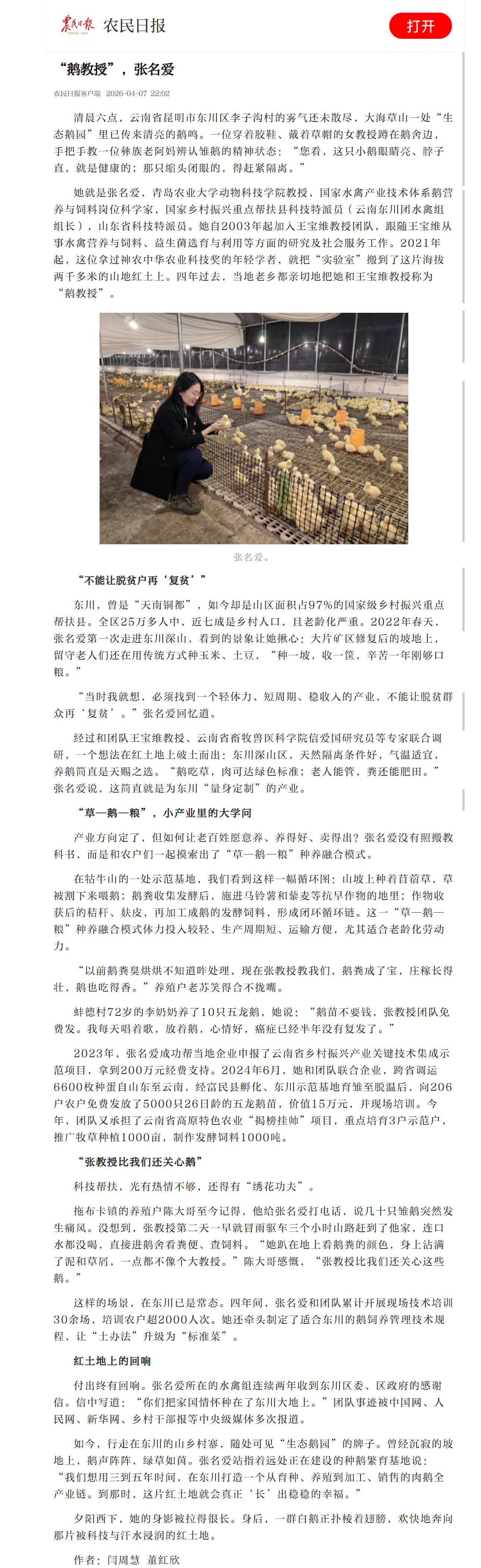 她就是张名爱,aa3044永利集团教授,国家水禽产业技术体系鹅营养与饲料岗位科学家,国家乡村振兴重点帮扶县科技特派员(云南东川团水禽组组长),山东省科技特派员。她自2003年起加入王宝维教授团队,跟随王宝维从事水禽营养与饲料、益生菌选育与利用等方面的研究及社会服务工作。2021年起,这位拿过神农中华农业科技奖的年轻学者,就把“实验室”搬到了这片海拔两千多米的山地红土上。四年过去,当地老乡都亲切地把她和王宝维教授称为“鹅教授”。