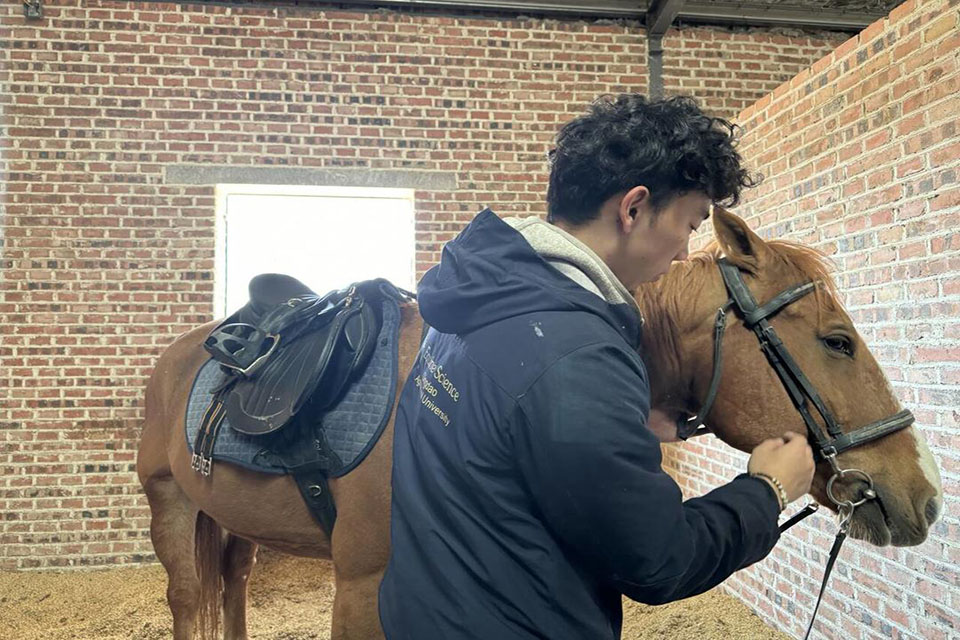 张锦轩还曾跟着法国修蹄师实习。“修蹄前要先评估马的步态,卸掉旧蹄铁后,还要根据马蹄形状打铁塑形,整个过程虽累但很严谨。”张锦轩表示,健康马匹每个月需修蹄一次,通常40分钟才能完成整套流程。而王荣健也曾在广州华亮马术实习时,凭借课堂知识及时发现一匹教学马精神不佳、食欲下降的异常。